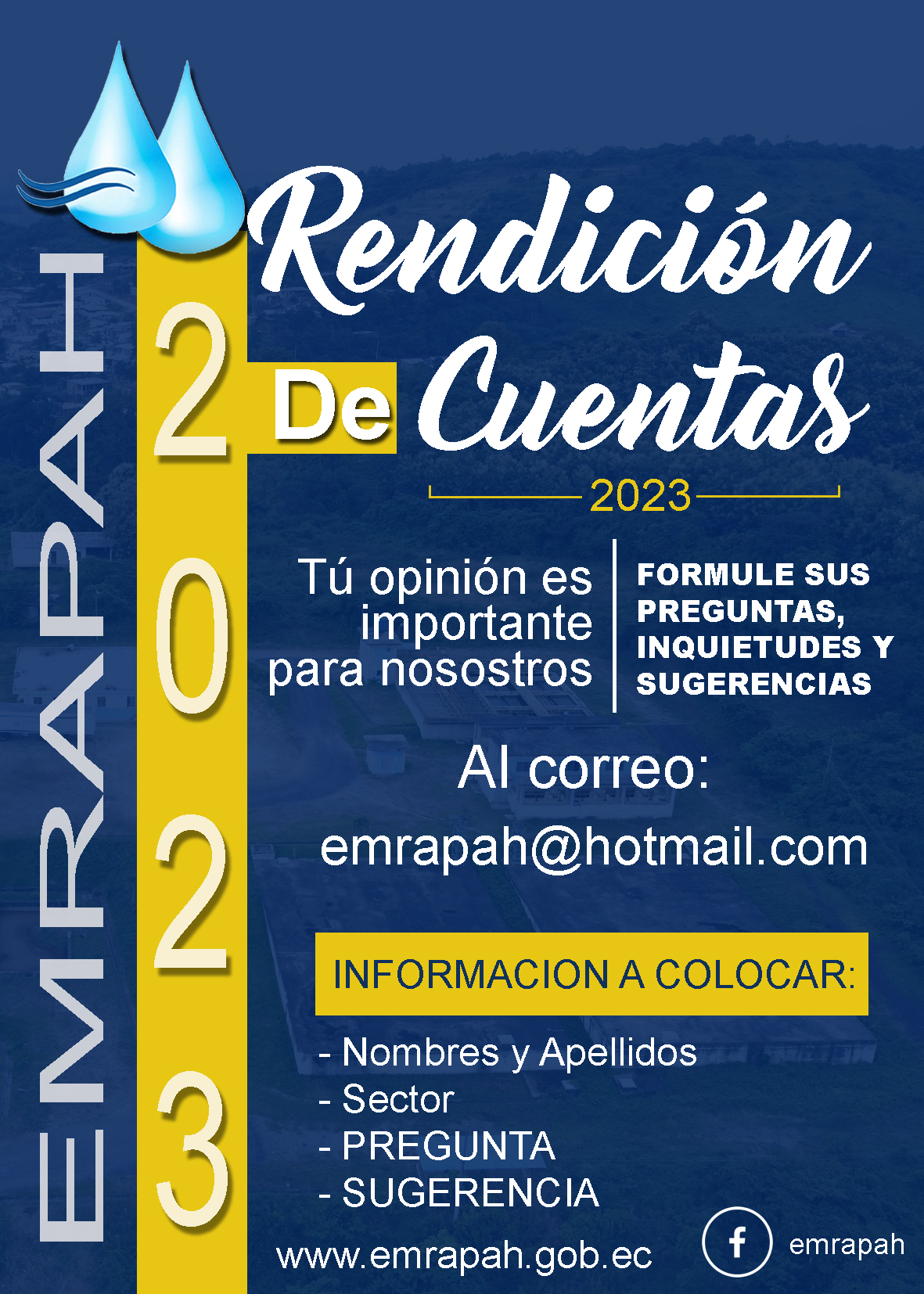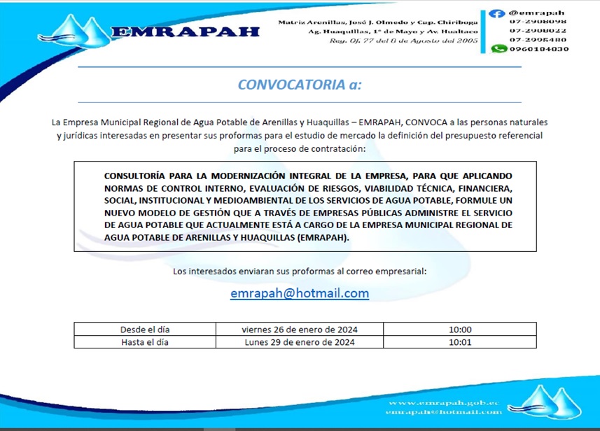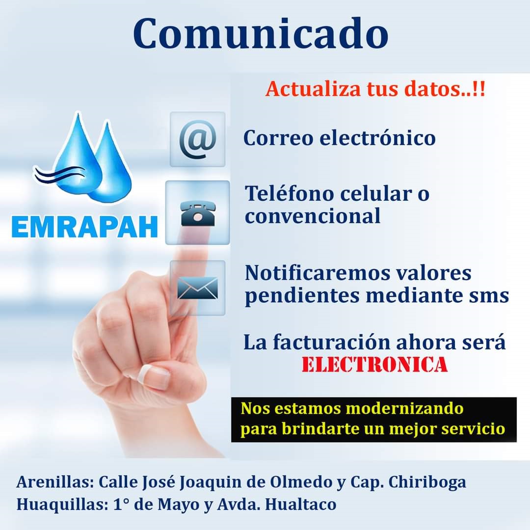 Art. 3.- MISIÓN INSTITUCIONAL. - La EMRAPAH, tiene como misión la gestión de los servicios de Agua Potable de las ciudades de Arenillas y Huaquillas, los principales procesos relacionados con el servicio de Agua Potable son: Captación, Bombeo, Tratamiento, Distribución, Comercialización, Mantenimiento, Administración Financiera y Contable, procesamiento de datos, servicios administrativos, servicios generales, ejecución de inversiones, guardianía, etc.